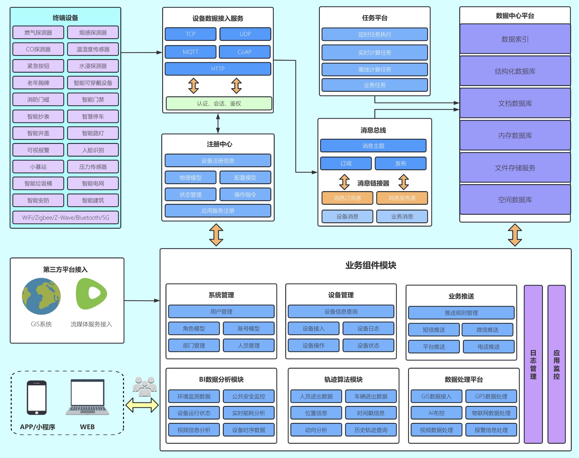 启创科技loT物联网平台解决方案是集数据收集、处理、可视化和设备管理为一体的综合服务平台。支持行业标准物联网协议,比如MQTT CoAP、HTTP等协议。支持公有云、私有云和本地部署等多种部署方式,在保证传输安全和存储安全的同时,通过集群以及大数据处理方式提高伸缩性、容错性和处理的实时性。