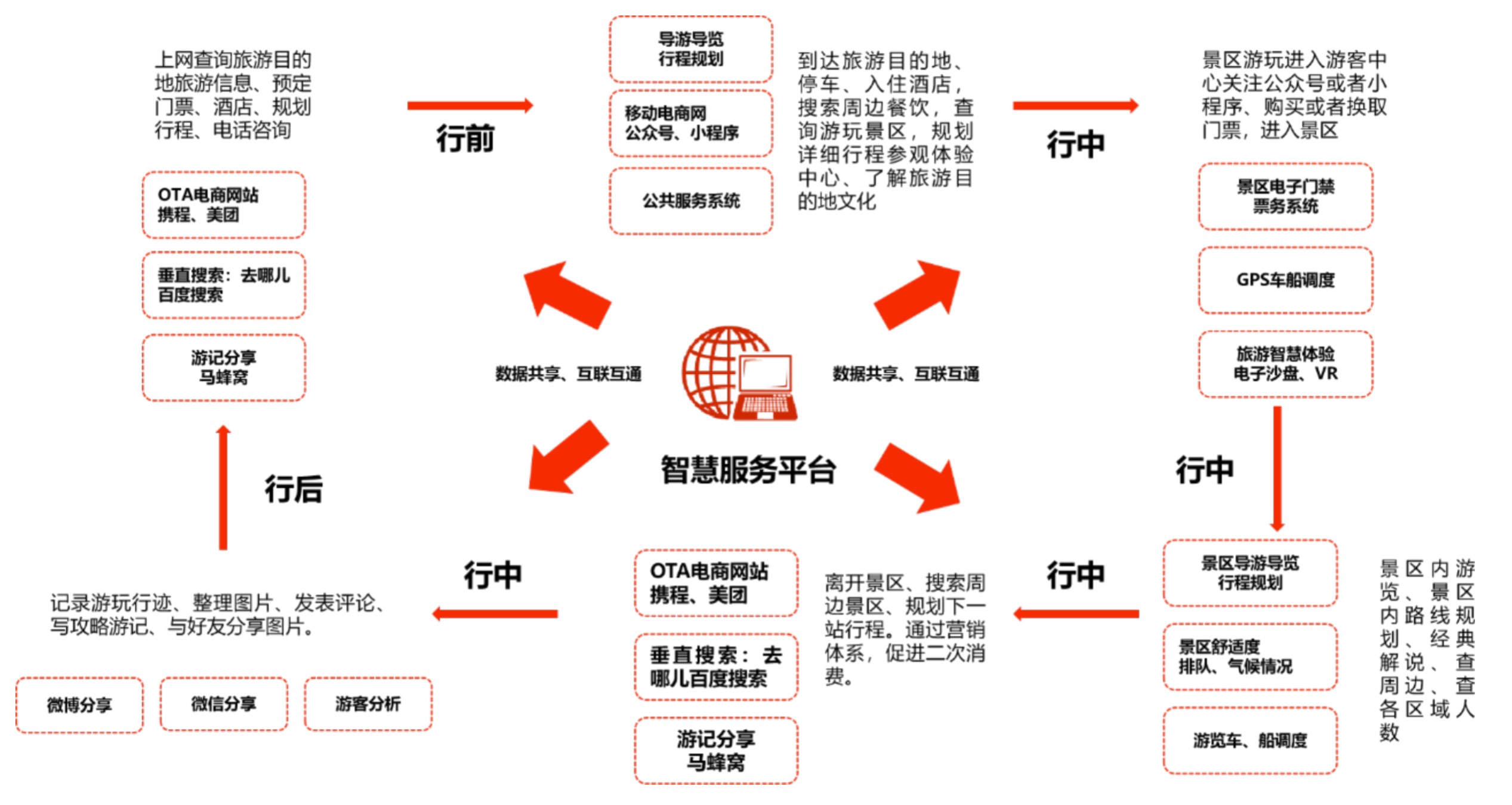 智慧文旅服务平台主要向旅游主管部门、旅游企业、旅游人才、游客提供智慧化信息服务。通过建立信息服务渠道,服务流程,服务标准,让所有的服务信息化、体系化、流程化、标准化、细致化。