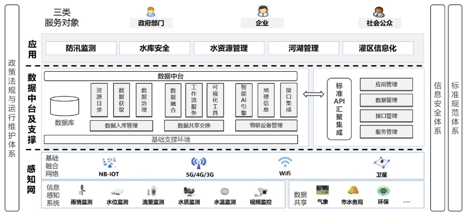 标准规范:是保障智慧水利的各个组成部分能够协调一致地工作,是保障各类信息互联互通,是保障项目建设过程和运维管理的规范、有序、高效的重要基础。通过充分利用已有国标和行标、参考国际上的先进标准、建设必要的标准规范,形成智慧水利标准规范体系。