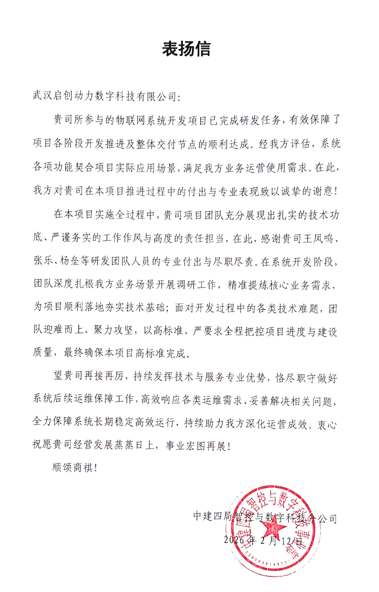 表扬信指出,由武汉启创动力承建的物联网系统开发项目,各项功能精准契合中建四局实际业务应用场景,有效保障了项目各阶段开发推进及整体交付节点的顺利达成,充分满足了业务运营使用需求。